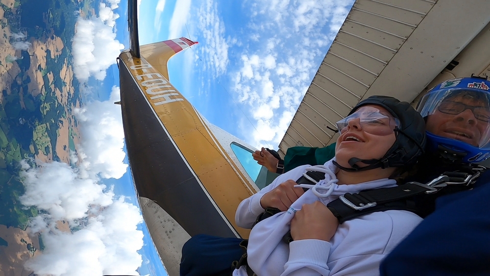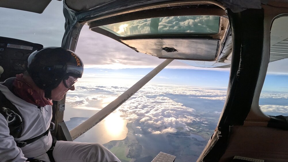 Geflogen wird mit einer Cessna 182, intern „Traudi“ genannt. Nach etwa 20 Minuten Einweisung steigst Du ein, rund 30 Minuten später steht die Tür in etwa 3.000 Metern offen. Der Ablauf ist klassisch: freier Fall, saubere Schirmfahrt, weiche Landung auf dem Platz. Plane insgesamt mindestens zwei Stunden ein. Gesprungen wird ganzjährig, in den Sommermonaten im 14-tägigen Rhythmus, jeweils nach telefonischer Abstimmung und natürlich wetterabhängig.